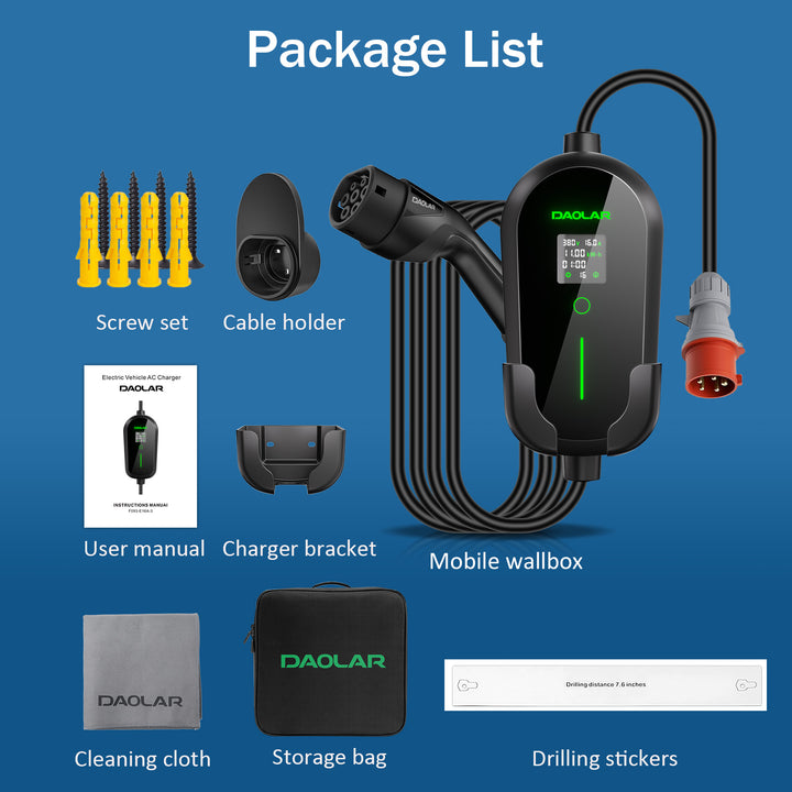 Daolar mobil vægboks 11KW, 3-faset type 2 ladekabel med CEE-stik, 12 timer og 6-16 A justerbar strøm til elbiler