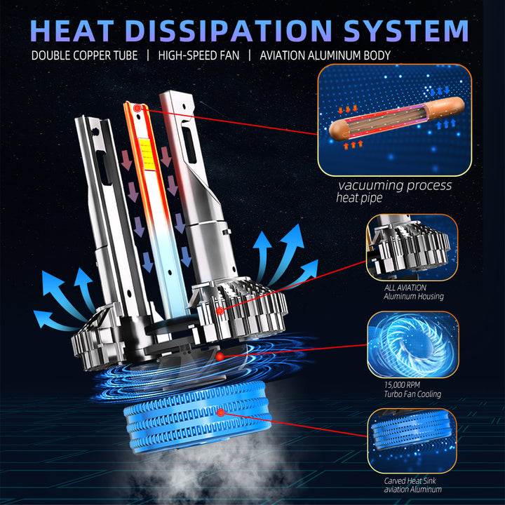 ❄️ Avanceret Varmeafledningssystem med 60.000+ Timers Levetid: Designet med en brancheførende varmeledning, Dobbelt Kobberrør og et fuldt luftfartsaluminiumskabinet. En højhastigheds, lydløs 15.000 RPM Turbo Blæser sikrer hurtig afkøling, så pærerne kan fungere pålideligt i over 60.000 timer og arbejde under ekstreme temperaturer fra -60℃ til +100.