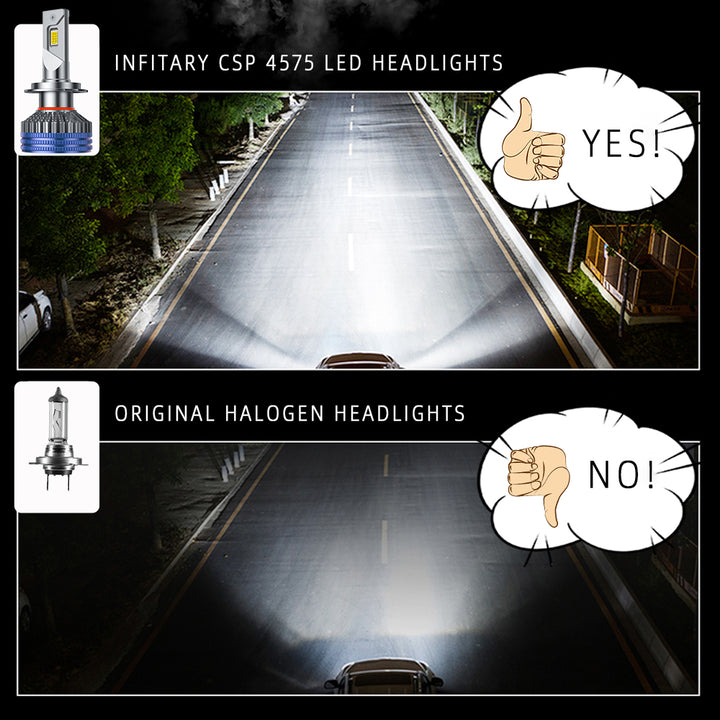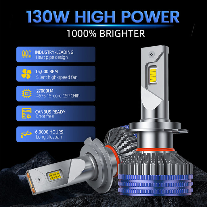 ⚡ 1000% Lysere & Ultra-Fokuseret Stråle (27000LM, 130W): Opgrader fra svage halogen til en brancheførende 130W (pr. sæt) højtydende output, der leverer utrolige 27.000 lumen klart, 6500K hvidt lys. Udstyret med avancerede 15-Core CSP 4575 chips for en superfokuseret, bredere og længere strålemønster, der sikrer sikrere natkørsel uden mørke pletter.